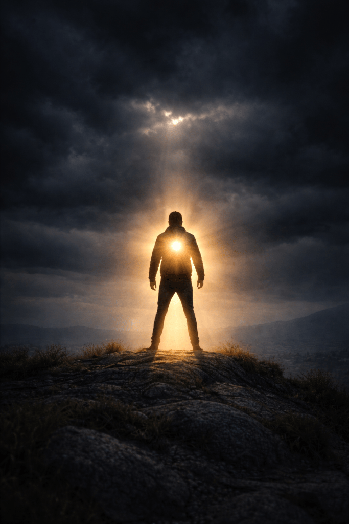 Silhouette figure glowing with inner light standing in darkness representing resilience and refusing to dim.